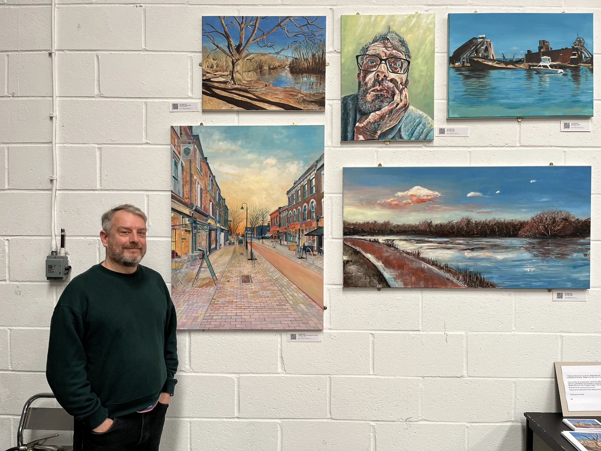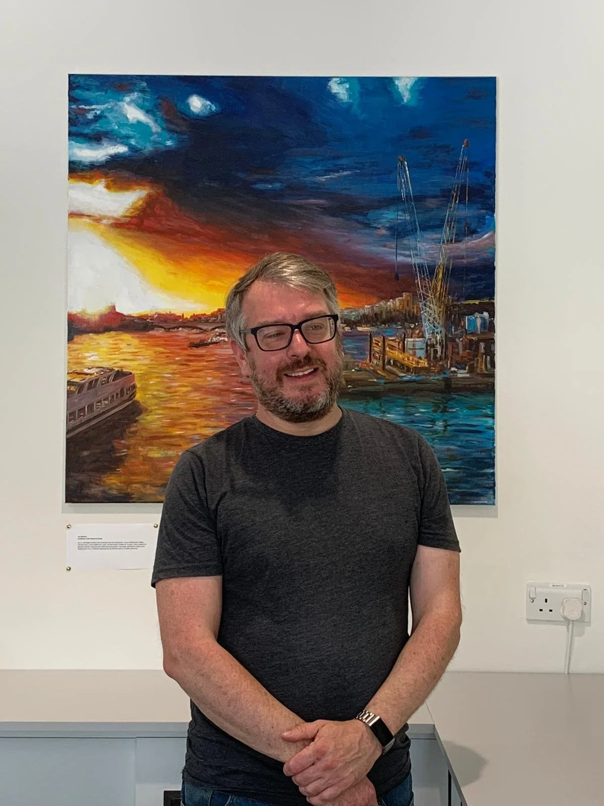 In front of my painting Evening Sunset over the Thames, as part of the E17 Art Trail in 2021